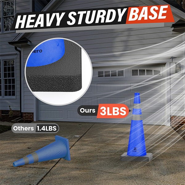 Heavy Sturdy Base: The base of parking cones is 13" X 13" and the weight of each cone is 3 lbs, it's weighted enough and won't be blown down easily by the wind