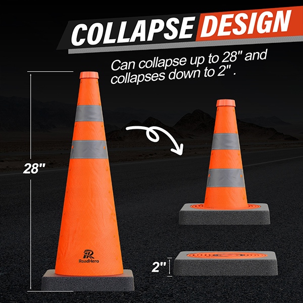 RoadHero 28 Inch Collapsible Traffic Safety Cones with Black Weighted Base, Construction Orange Cones with Reflective Collars for Road Safety, Driving Training, Parking Lots, 4 Pack