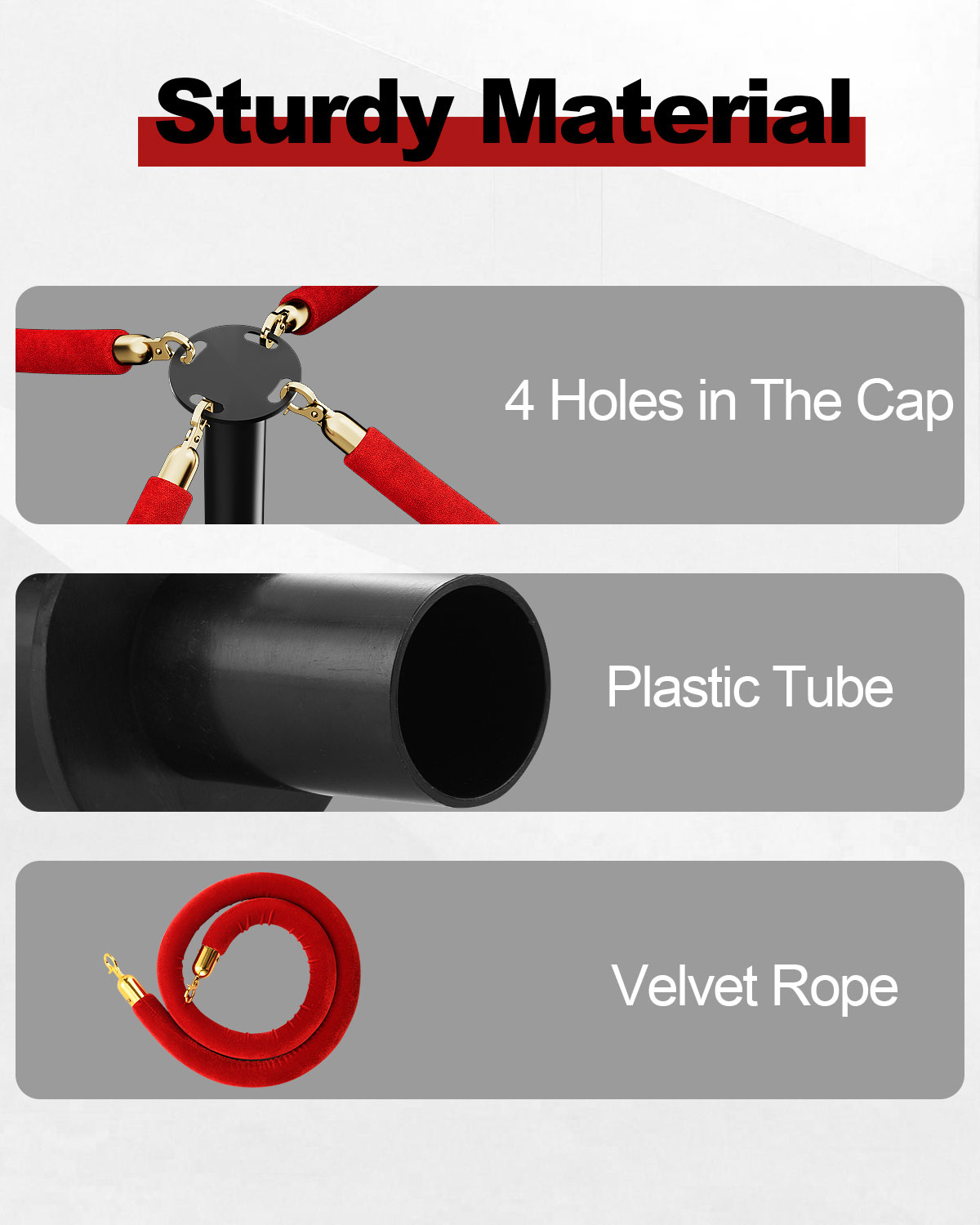 Packing List: You will receive 4 X rubber bases, 8 X plastic safety poles, 8 X plastic connecting tubes, 4 X plastic top caps, and 3 X 5 ft black velvet rope
